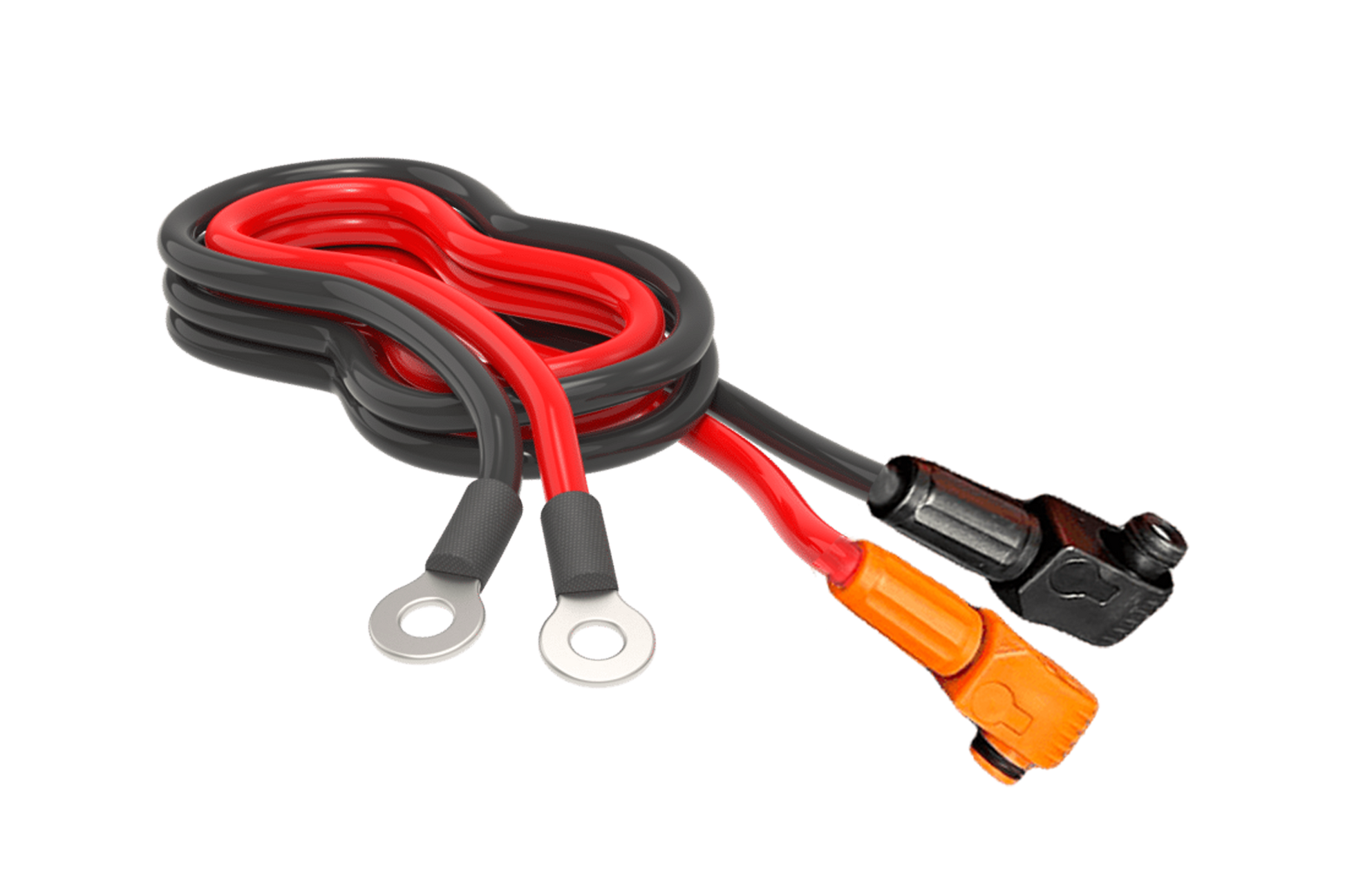 A heavy-duty connection cable designed for secure, efficient power transfer between NE120 connectors and ring terminals. Ideal for integrating external batteries or connecting to busbars in off-grid and mobile power systems.