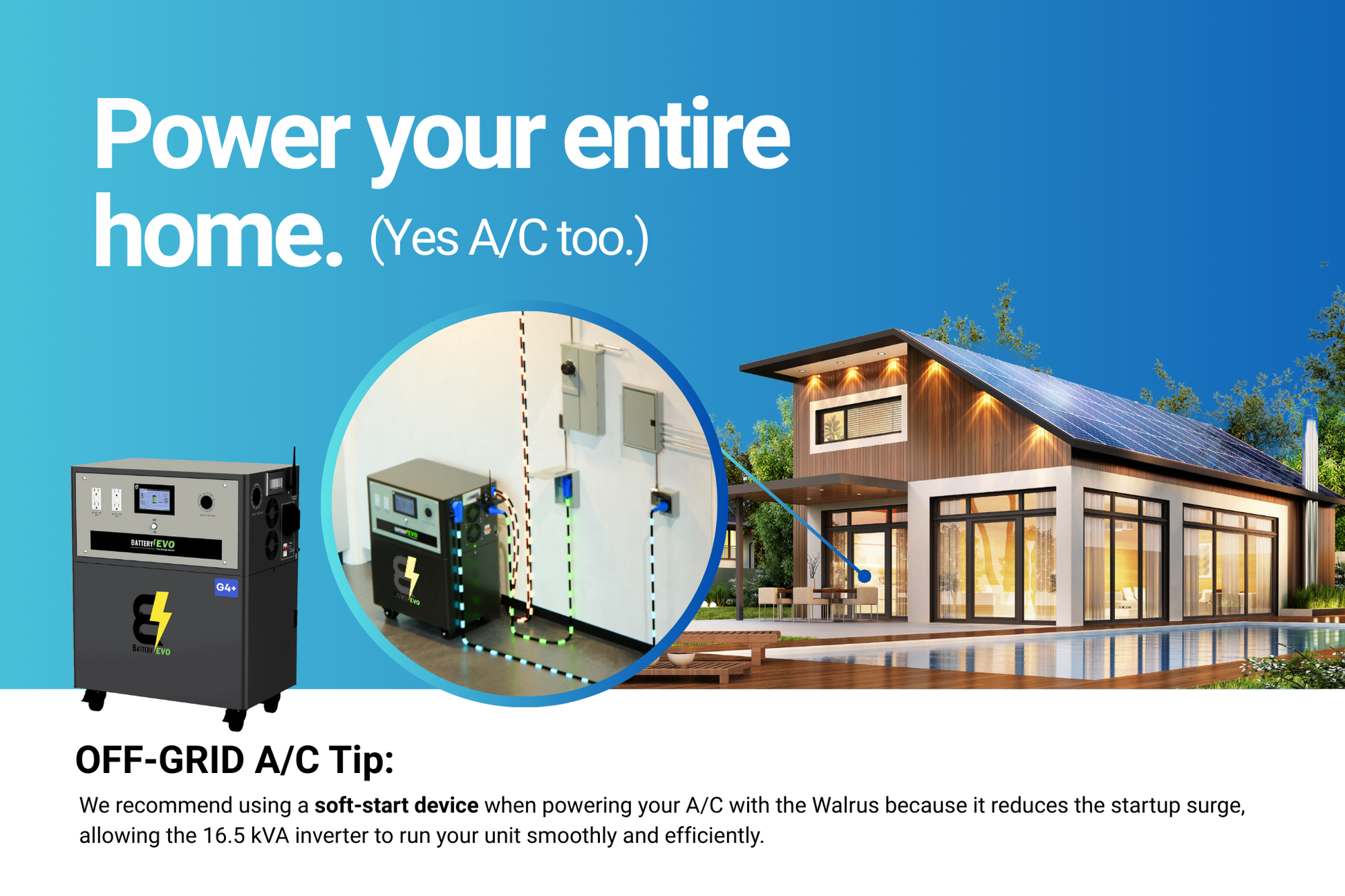 The Walrus G4 is the perfect whole home generator for any grid-tied or off-grid setup. Keep the lights on during power outages and lower your electric bill up to 95%.